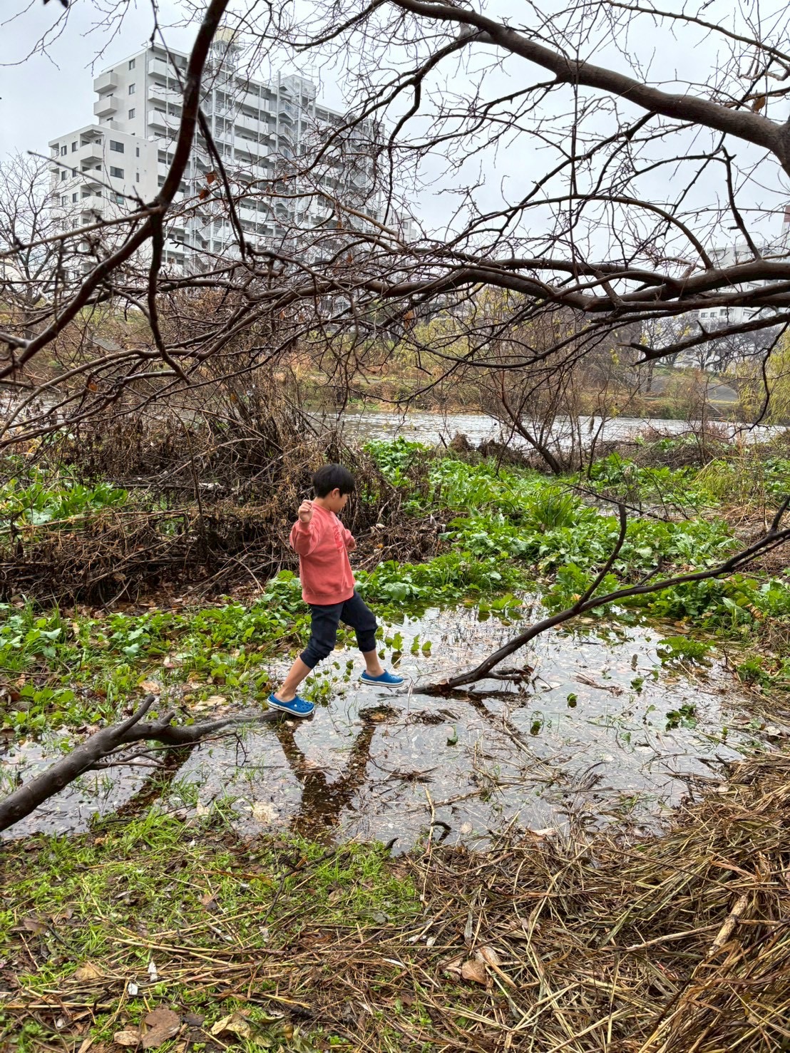 水たまりに木で一本橋をつくって遊んだり、